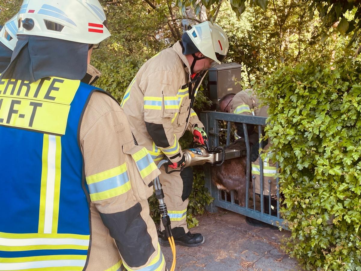 Anschließend setzten die Feuerwehrleute einen hydraulischen Spreizer ein, um die Gitterstäbe vorsichtig auseinanderzudrücken. So gelang es, das Tier zügig und schonend aus seiner Lage zu befreien.