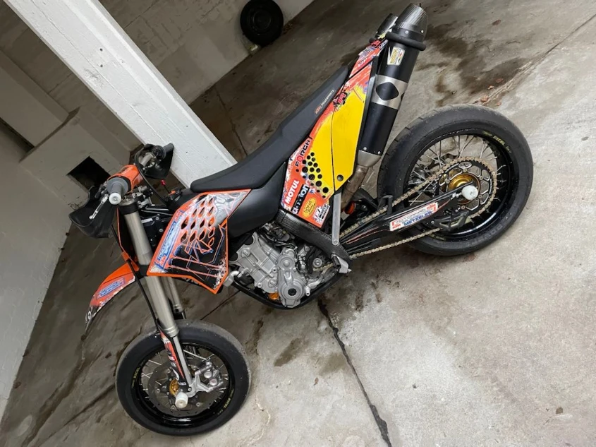 Bei den entwendeten Maschinen handelt es sich um zwei Motocross-Motorräder ohne Straßenzulassung. Das erste Fahrzeug ist eine schwarz-orangene KTM 450 SMR mit einem auffälligen Doppelauspuff und Fußrasten, in die der Schriftzug „RMP“ eingraviert ist.