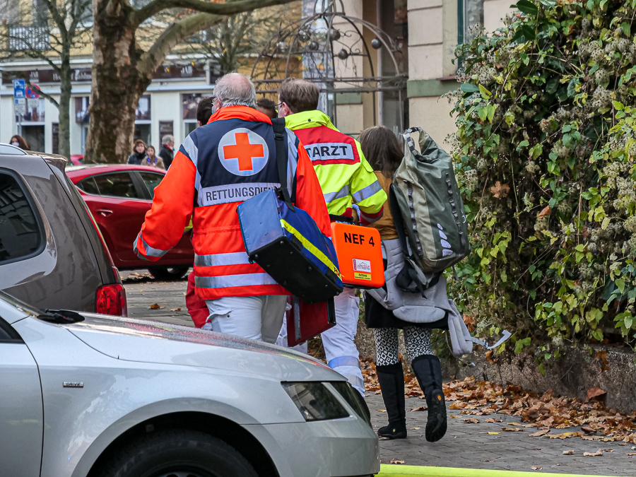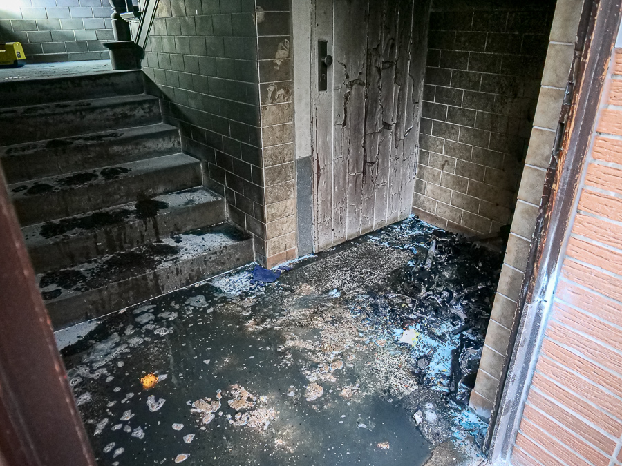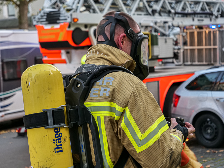 Als kurze Zeit später die ersten Feuerwehrkräfte eintrafen, stellte sich der Wohnungsbrand als im Treppenhaus befindlicher brennender Fahrradanhänger für Kinder heraus. Anwohner hatten bereits mit Feuerlöschern einen Löschversuch unternommen. Durch den Brandrauch war den Bewohnern der Fluchtweg durch das Treppenhaus abgeschnitten. Die meisten Bewohner ließen sich, am offenen Fenster stehend, von den Einsatzkräften beruhigen, bis die Lösch- und Lüftungsmaßnahmen beendet waren. Zwei Männer, eine 43 Jahre alte Frau und ihr 3 Jahre altes Kind wurden durch die Retter mit Brandfluchthauben aus dem Gebäude geführt. Auch Hund „Sunny“ konnten die Einsatzkräfte unverletzt retten. Das Tier wurde von einer Nachbarin in Obhut genommen. Die Mutter und ihr Kind mussten mit dem Rettungsdienst mit Verdacht auf eine Rauchgasvergiftung in ein Krankenhaus gebracht werden. Alle anderen Mieter des Hauses konnten in ihre Wohnungen zurückkehren bzw. dort verbleiben
